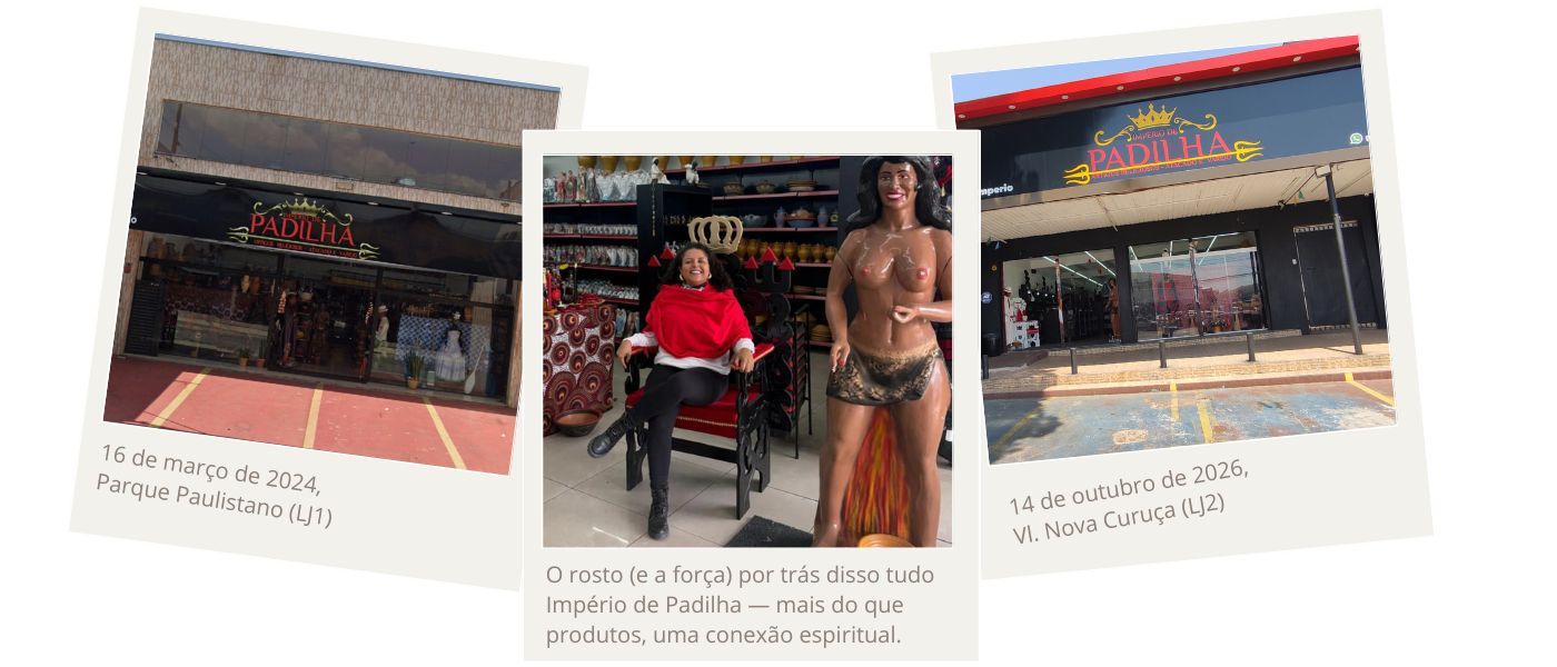 Fundada em 16 de março de 2024, no Parque Paulistano (LJ1), a Império de Padilha nasceu com um sonho simples, mas poderoso — transformar a forma como as pessoas vivem e acessam o sagrado. Com o crescimento e a confiança de quem acredita no nosso trabalho, expandimos com a inauguração da segunda unidade (LJ2), em 14 de outubro de 2026.